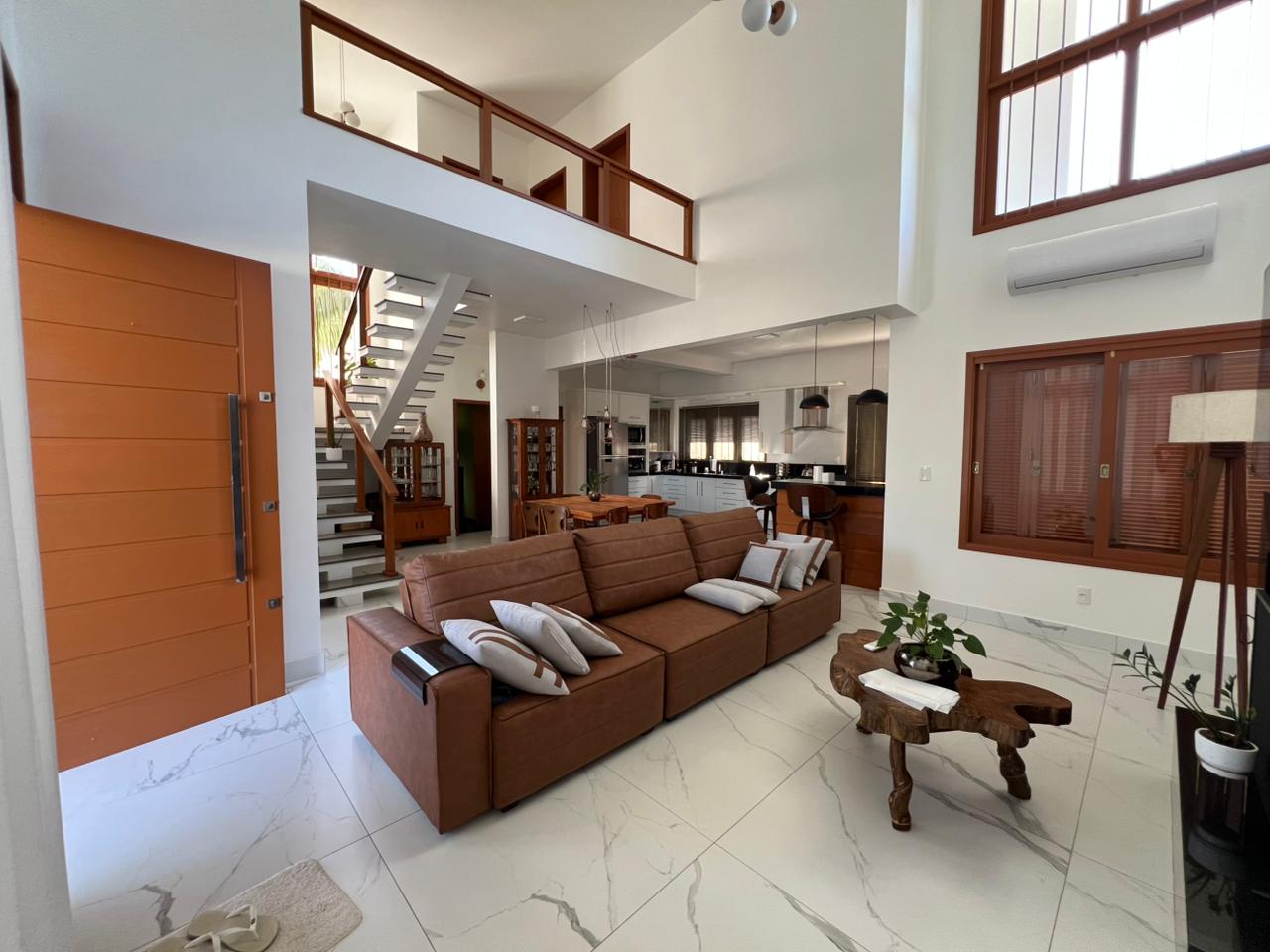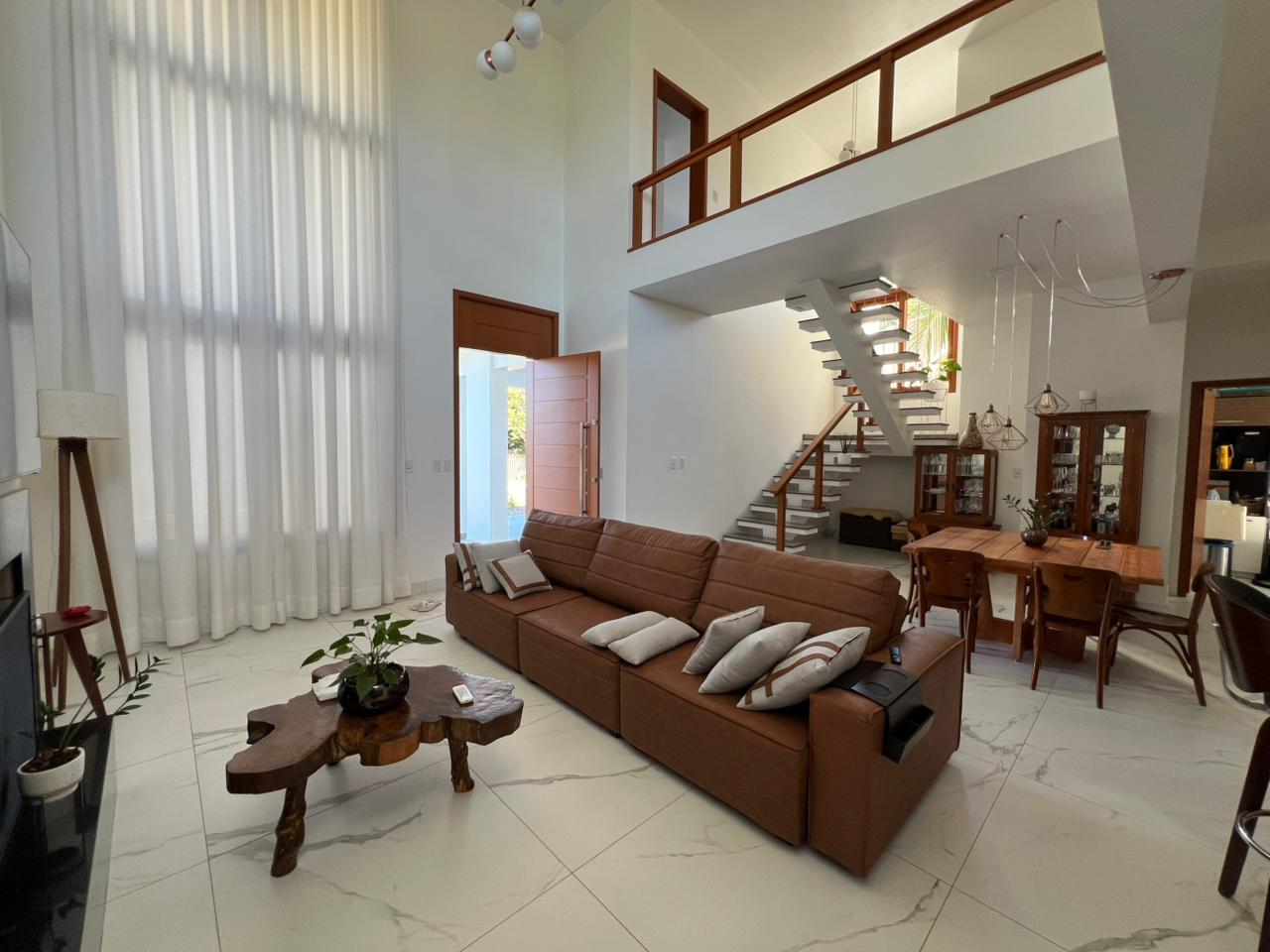 Ao entrar, você é recebido por um living imponente com pé-direito duplo, que garante amplitude, iluminação natural e uma ventilação cruzada impecável. O acabamento em porcelanato de grandes formatos com veios marmorizados eleva o nível de sofisticação de cada ambiente.